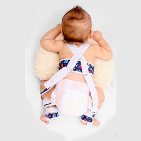 Para tratamento da luxação congênita do quadril do recém nascido até o 6º mês de idade. O correto ajuste nas tiras permite limitar os graus de movimento dos quadris, mantendo em flexão e abdução e permitindo movimentos do bebê.