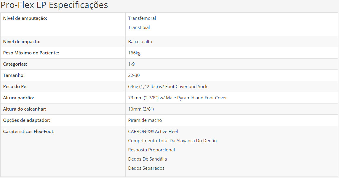 Um bom nível de força no tornozelo, o retorno de energia e a dinâmica em geral, são itens que não atendiam usuários com cotos mais longos. Pro-Flex LP foi criado especialmente para atender esta demanda e para além disso, garantir um movimento mais suave, desde o contato com o calcanhar no solo, até a saída da ponta do pé.