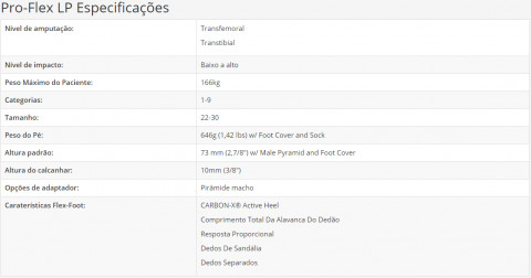 Pro-Flex LP oferece um nível maior de movimentação do tornozelo e uma melhoria significante em comparação com o pé de fibra de carbono mais simples, permitindo uma melhor dorsi-flexão.